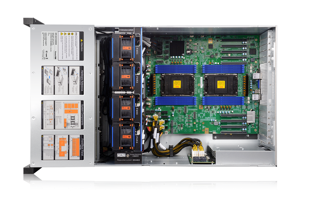 采用Intel C741系列服务器专用芯片组,支持第四代/第五代英特尔®至强®可扩展处理器;该机型拥有16个DDR5 DIMMs插槽并最多支持2TB内存容量;支持12个3.5"热插拔硬盘;最大支持4张双宽AI加速卡和6张标准PCIe卡,灵活搭配满足不同应用场景需求;板载集成BMC,支持远程管理。