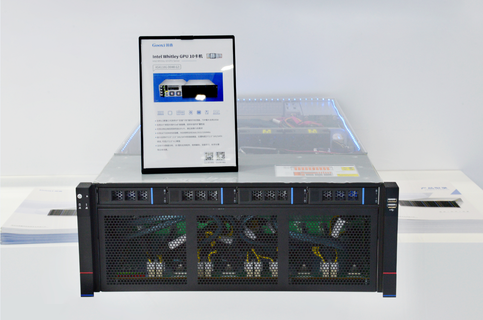 此次展会展出的Gooxi Intel Whitley 4U10卡GPU服务器具备性能卓越、架构灵活、扩展性强、配置丰富和可靠性高等特点,支持2颗第三代至强系列可扩展处理器,4U空间内搭载10张高算力GPU卡能够为AI训练任务给予给予强大的X86处理平台针对推理及训练应用,这其中包括英伟达A800,GeForce RTX30系列显卡,后置4个硬盘可以选配NVMe SSD,有效提高数据的传输存储效率,支持高速网络,存储和其他IO扩展。既可以覆盖大模型、高带宽需求的高算力训练场景和高并行的HPC科学计算场景,也可以覆盖部署大模型的数据中心级推理场景。顺利获得括物联网、大数据和云计算等技术,支撑能源高效互联,有效解决新能源场站的集中监控和管理,为安全、高效生产给予保障。
