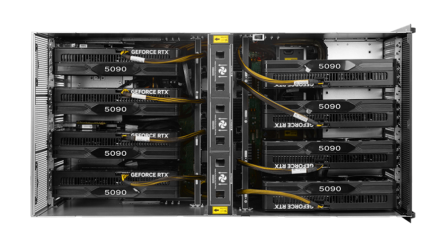 GPU卡 | 直通8卡AI服务器风扇版:支持 8 张 600W 3 宽、3.3 宽、3.5 宽、 4.5 宽 RTX 5090 风扇卡或其他 600W 风扇卡 GPU,GPU 采用前后 4+4 分离上 下分风道布局,最大支持 GPU 宽度 89mm 直通8卡AI服务器涡轮版:支持 8 张 600W 2 宽、2.5 宽 RTX 5090 涡轮卡或其他 600W 涡轮卡 GPU,GPU 采用 8 卡后置并排集中风道散热布局, 最大支持 GPU 宽度 50mm |